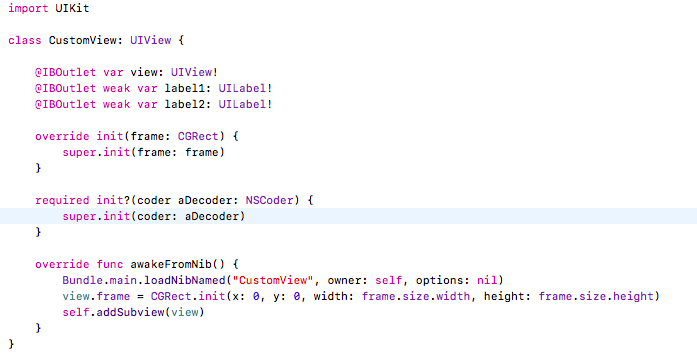 1 2 3 4 5 6  | //导入布局文件 Bundle.main.loadNibNamed("CustomView", owner: self, options: nil) //设置view画面的大小和位置 view.frame = CGRect.init(x: 0, y: 0, width: frame.size.width, height: frame.size.height) //将view添加到自定义控件的画面中 self.addSubview(view)  |