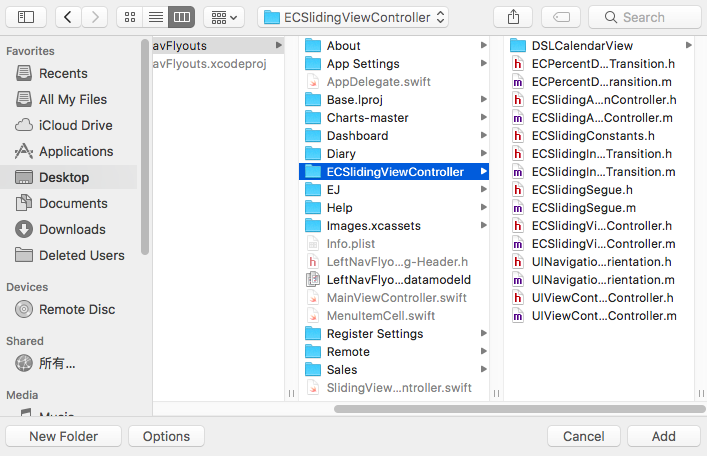 iOS中菜单切换使用的是ECSlidingViewController进行控制的 先将ECSlidingViewController的所有文件拷贝到工程目录下