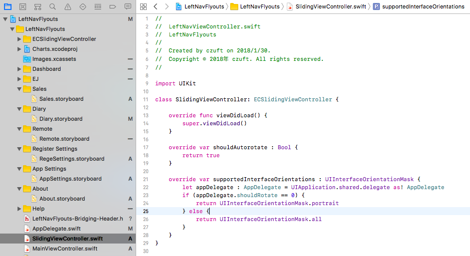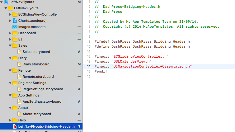 1 2 3 4 5 6 7  | #ifndef LeftNavFlyouts_Bridging_Header_h #define LeftNavFlyouts_Bridging_Header_h #import "ECSlidingViewController.h" //ECSlidingViewController的引用 #import "DSLCalendarView.h" //Calendar控件的引用 #import "UINavigationController+Orientation.h" #endif  |