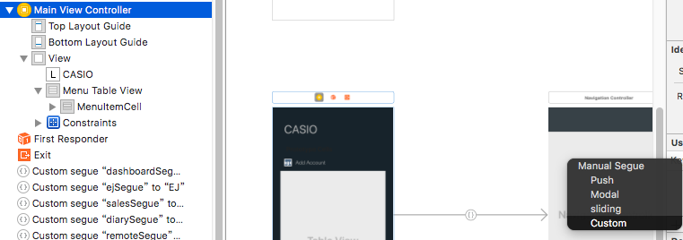 画面跳转必须从Menu画面的ViewController连接到想要跳转的画面,类型选择Custom