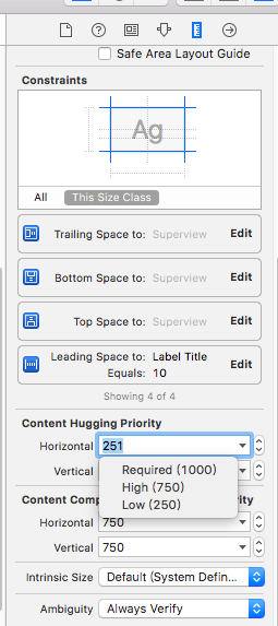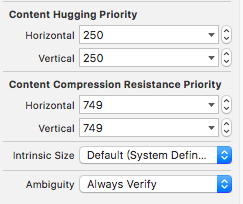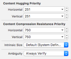 - Content Hugging Priority:表示一个控件“抗拉伸”的优先级。优先级越高,越不容易被拉伸,默认是:251。