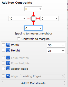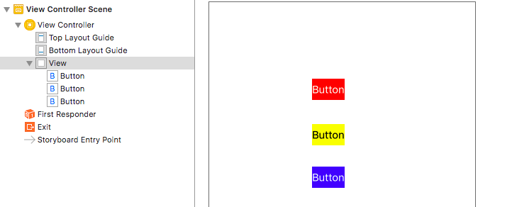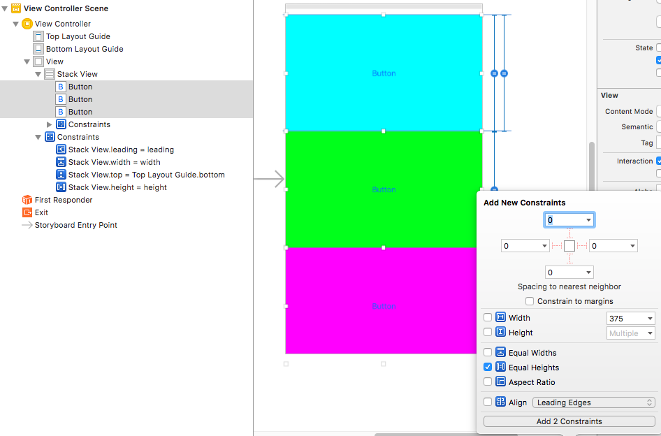 (2)添加三个按钮到StackView中,设置相应的样式之后,选中三个button添加等高约束