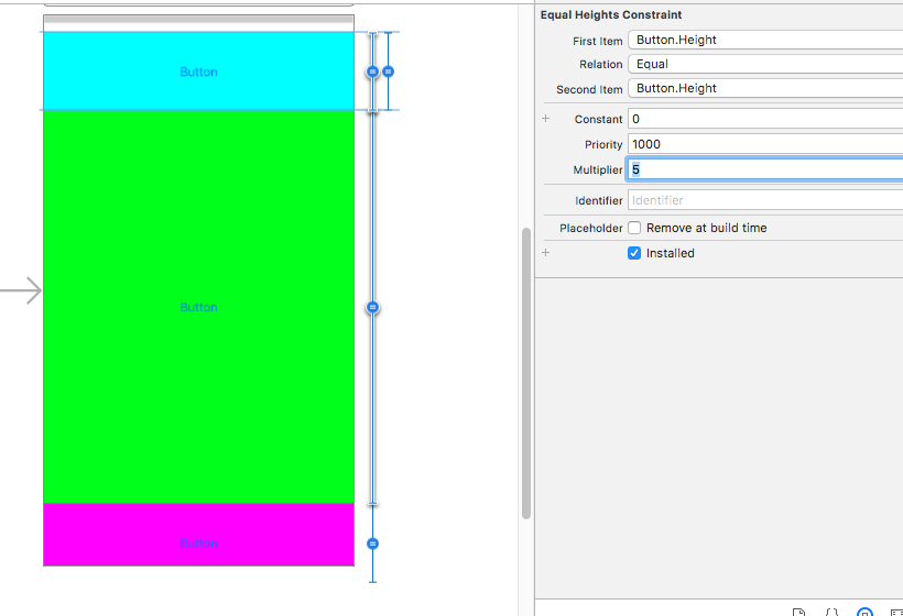 (3)选择其中一个button右侧的等到约束线,在右侧属性观察器中,设置属性