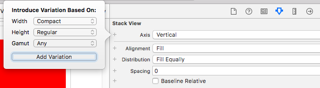 (1) 点击 StackView 的 Axis 选项旁边的 + 按钮。Width 选择 Any,Height 选择 Compact。然后点击“Add Variation”添加