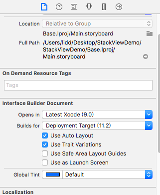 双击Main.storyboard,在右侧文件观察器中, "Use Safe Area Layout Guides" 选项取消选中。