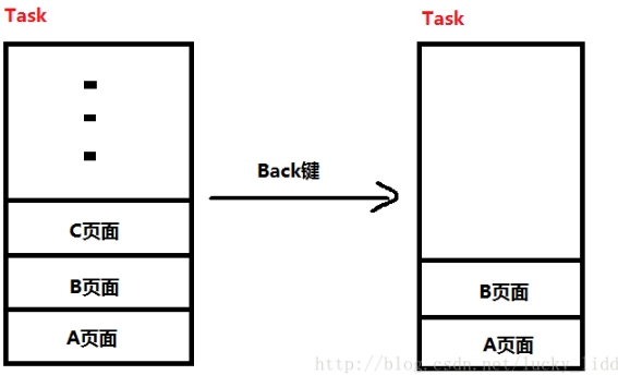 当在A页面单击 返回 按钮时,处于 Task1 中栈顶A页面被销毁,再次单击 返回 按钮,处于 Task1 中栈底A页面被销毁,此时 Task1 中没有任何的 Activity,Task1 也随之被销毁。如果此时再单击 返回 按钮时,Task2 中B页面被销毁。