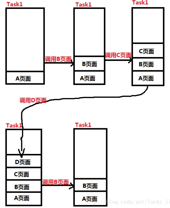 例如:B页面被设为singleTask模式,当A页面启动B页面时,B被创建并追加到 Task 中。当B页面启动C页面,C页面再启动D页面。当D页面启动B