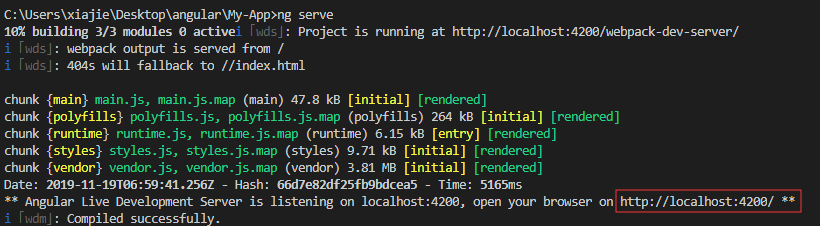 第一个项目¶ 创建项目¶ 进入到像创建项目的文件夹,打开cmd到对应的目录,执行 1ng new my-app 这个命令会创建一个名字叫my-app的目录,并在目录下自动创建项目 运行项目¶ 用vscode打开my-app文件夹,在Terminal中输入 1ng serve 项目就会开始编译并运行 显示以上信息就代表运行成功,红框中的地址就是项目访问的网址