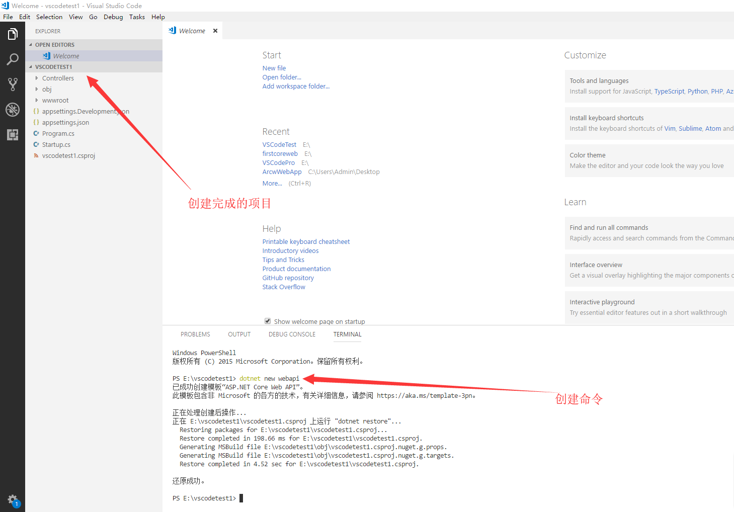 打开VS Code,输入命令 dotnet new webapi,创建.NET Core Web ApI项目,创建完成的项目如下图所示