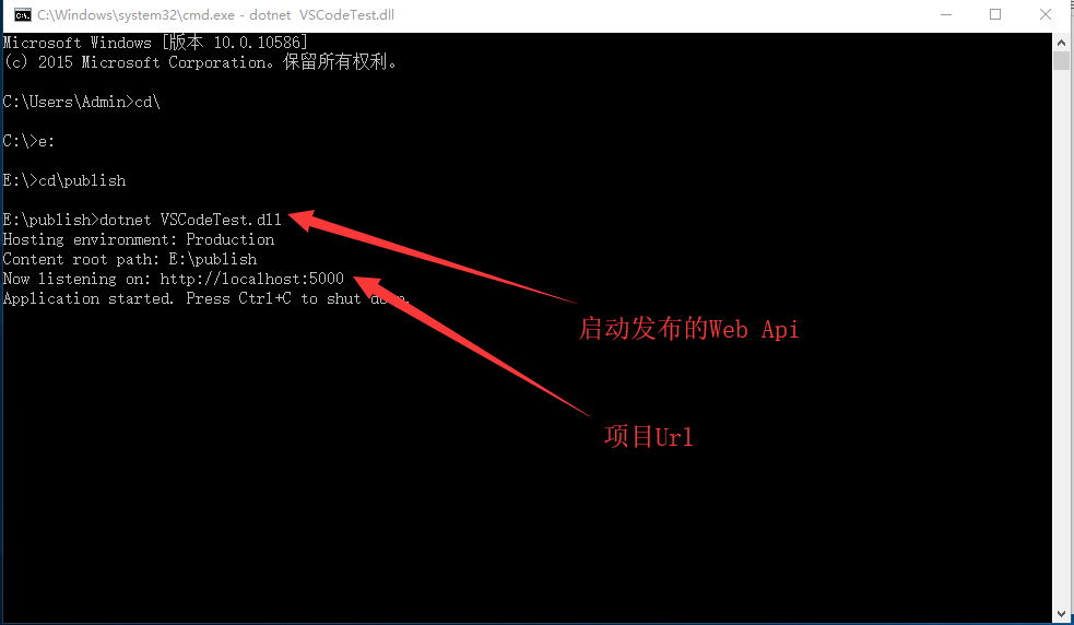 2.发布包部署启动 使用cmd命令,打开发布包所在的路径,输入命令 dotnet xxxx.dll(xxxx表示)项目名称,在浏览器中输入 命令框中给出的新项目地址,调用API接口