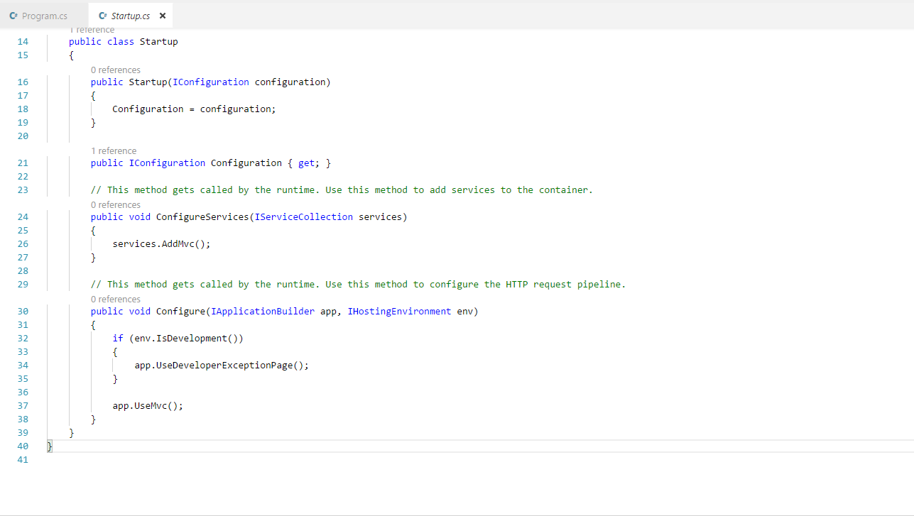 - Configure方法是asp.net core程序用来具体指定如何处理每个http请求的, 例如我们可以让这个程序知道我使用mvc来处理http请求, 那就调用app.UseMvc()这个方法就行. 但是目前, 所有的http请求都会导致返回"Hello World!"