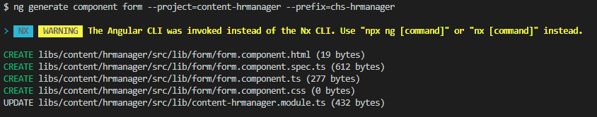 1  | ng generate component form --project=content-hrmanager --prefix=chs-hrmanager  |