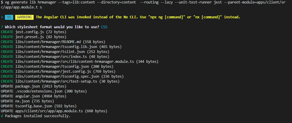 1  | ng generate lib hrmanager --tags=lib:content --directory=content --routing --lazy --unit-test--runner jest --parent-module=apps/client/src/app/app.module.ts  |