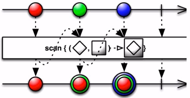 1 2 3 4 5 6  | // scan的初始值为0, 每一次累加完的结果, 立马发射出去, 作为下一次的初始值进行累加 interval$: 0------1------2------3------4------5------6------ filter$: 0-------------2-------------4-------------6------ \ \ \ 0+2 2+4 6+6 scan$: 0-------------2------------ 6-------------12-----  |