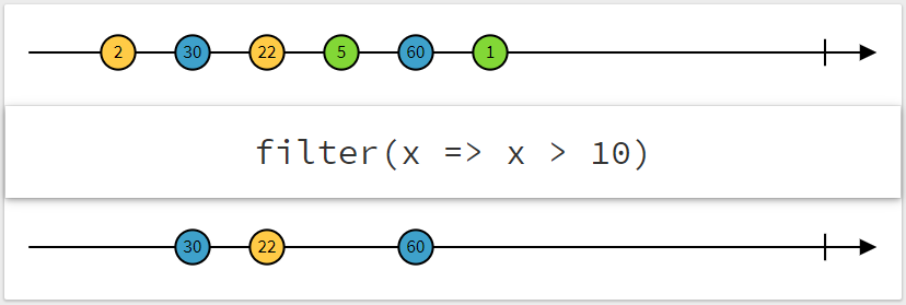 1 2 3 4 5 6 7 8 9 10 11  | // RxJS v6+ import { from } from 'rxjs'; import { filter } from 'rxjs/operators'; // 发射(1,2,3,4,5) const source$ = from([1, 2, 3, 4, 5]); const new$ = source.pipe(filter(num => num % 2 === 0)); // 输出: '2', '4' new$.subscribe(val => console.log(val));  |