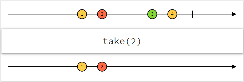 1 2 3 4 5 6 7 8 9  | // RxJS v6+ import { of } from 'rxjs'; import { take } from 'rxjs/operators'; const target$ = of(1, 2, 3, 4, 5); // 取两个值 const new$ = target$.pipe(take(2)); // 输出: '1', '2' new$.subscribe(val => console.log(val));  |