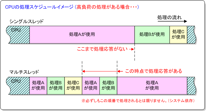 上記の場合、シングルスレッドでは「処理A」が終了するまで「処理B」、「処理C」は処理されません、つまりシステムからの応答が返ってきません。したがって負荷の高い処理が行われるといちいち待たされるような感じになります。 これに対してマルチスレッドの場合、負荷の大きい処理が先に起動しても、その終了するのを待つことなく次々と軽い処理が先に終了して結果を返すことができる為、スループットが向上します!