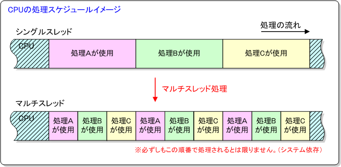 以下参照:IT専科 マルチスレッド処理は各スレッド(=各処理)に対してCPUの資源をタイムスライス(時分割)という技術を使って分け合うことで実現しています。例えば、「処理A」、「処理B」、「処理C」と処理していく場合、次のようなイメージになります。