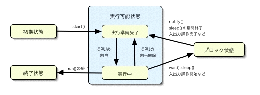 Javaのスレッドは、作成されてから消滅するまでにいくつかの状態を遷移していきます。状態の遷移を図に表すと、次のようになります。