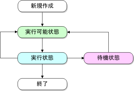 新しいスレッドを作成した状態です。この状態ではまだスレッドは動作していません。次の章で説明するstart メソッドにより、実行可能状態となります。
