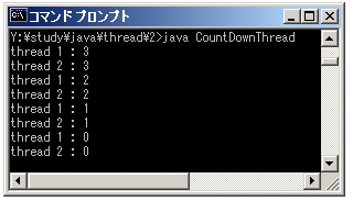 この方法を用いたプログラムを見てみましょう。次のプログラムは、3から0まで数字をカウントダウンする処理を2つのスレッドで同時に実行するプログラムです。