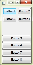 1 2 3 4 5 6 7 8 9 10 11 12 13 14 15 16 17 | shell.setLayout(new FillLayout(SWT.VERTICAL)); Composite c1 = new Composite(shell, SWT.NONE); GridLayout gl = new GridLayout(); gl.numColumns = 2; c1.setLayout(gl); new Button(c1, SWT.PUSH).setText("Button1"); new Button(c1, SWT.PUSH).setText("Button2"); new Button(c1, SWT.PUSH).setText("Button3"); new Button(c1, SWT.PUSH).setText("Button4"); Composite c2 = new Composite(shell, SWT.NONE); c2.setLayout(new FillLayout(SWT.VERTICAL)); new Button(c2, SWT.PUSH).setText("Button5"); new Button(c2, SWT.PUSH).setText("Button6"); new Button(c2, SWT.PUSH).setText("Button7"); new Button(c2, SWT.PUSH).setText("Button8"); |