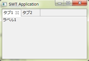 1 2 3 4 5 6 7 8 9 10 11 12 13 14 15 16 17 18 19 20 21 | shell.setLayout(new FillLayout()); CTabFolder tabFolder = new CTabFolder(shell,SWT.CLOSE); // 1つめのタブアイテムを作成 CTabItem tabItem1 = new CTabItem(tabFolder,SWT.NONE); tabItem1.setText("タブ1"); // 1つめのタブにウィジェットを設定 Label label1 = new Label(tabFolder,SWT.NONE); label1.setText("ラベル1"); tabItem1.setControl(label1); // 2つめのタブアイテムを作成 CTabItem tabItem2 = new CTabItem(tabFolder,SWT.NONE); tabItem2.setText("タブ2"); // 2つめのタブにウィジェットを設定 Label label2 = new Label(tabFolder,SWT.NONE); label2.setText("ラベル2"); tabItem2.setControl(label2); |