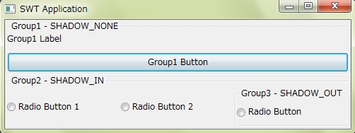 1 2 3 4 5 6 7 8 9 10 11 12 13 14 15 16 17 18 19 20 21 22 23 24 25 26 27 | shell = new Shell(); shell.setText("SWT Application"); shell.setLayout(new FillLayout(SWT.VERTICAL)); Group g1 = new Group(shell, SWT.SHADOW_NONE); g1.setLayout(new FillLayout(SWT.VERTICAL)); g1.setText("Group1 - SHADOW_NONE"); Label l1_1 = new Label(g1, SWT.NONE); l1_1.setText("Group1 Label"); Button b1_1 = new Button(g1, SWT.PUSH); b1_1.setText("Group1 Button"); Group g2 = new Group(shell, SWT.SHADOW_IN); g2.setText("Group2 - SHADOW_IN"); g2.setLayout(new FillLayout(SWT.HORIZONTAL)); Button b2_1 = new Button(g2, SWT.RADIO); b2_1.setText("Radio Button 1"); Button b2_2 = new Button(g2, SWT.RADIO); b2_2.setText("Radio Button 2"); Group g3 = new Group(g2, SWT.SHADOW_OUT); g3.setText("Group3 - SHADOW_OUT"); g3.setLayout(new FillLayout()); Button b3_1 = new Button(g3, SWT.RADIO); b3_1.setText("Radio Button"); shell.setSize(400, 200); |