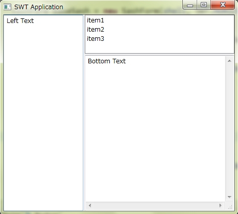 1 2 3 4 5 6 7 8 9 10 11 12 13 14 15 16 17 18 19 20 | shell.setLayout(new FillLayout()); SashForm baseSash = new SashForm(shell, SWT.HORIZONTAL); //lefthand sash Text leftText = new Text(baseSash, SWT.BORDER | SWT.MULTI); leftText.setText("Left Text"); SashForm leftSash = new SashForm(baseSash, SWT.VERTICAL); List list = new List(leftSash, SWT.BORDER); list.add("item1"); list.add("item2"); list.add("item3"); Text bottomText = new Text(leftSash, SWT.BORDER | SWT.MULTI | SWT.V_SCROLL | SWT.H_SCROLL); bottomText.setText("Bottom Text"); //Sashの境界を調整 上部20% 下部80% leftSash.setWeights(new int [] {20,80}); |