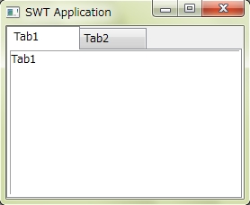 1 2 3 4 5 6 7 8 9 10 11 12 13 14 15 16 17 18 19 20 21 | shell.setLayout(new FillLayout()); TabFolder tabFolder = new TabFolder(shell,SWT.NULL); // 1つめのタブを作成 TabItem item1 = new TabItem(tabFolder,SWT.NULL); item1.setText("Tab1"); // 1つめのタブにLabelを追加 Label label1 = new Label(tabFolder,SWT.BORDER); label1.setText("Tab1"); item1.setControl(label1); // 2つめのタブを作成 TabItem item2 = new TabItem(tabFolder,SWT.NULL); item2.setText("Tab2"); // 2つめのタブにLabelを追加 Label label2 = new Label(tabFolder,SWT.BORDER); label2.setText("Tab2"); item2.setControl(label2); |