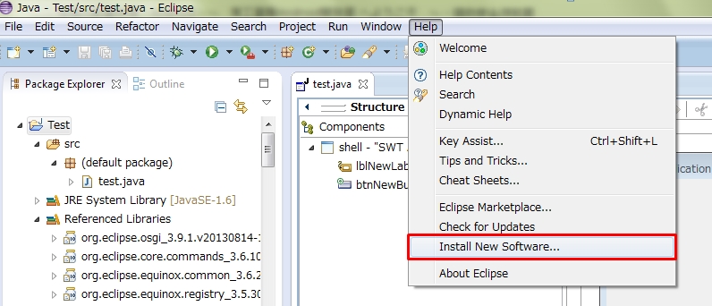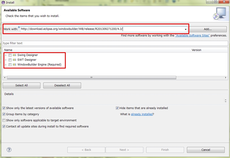 - ダイアログの【Work with】へこのサイト【 http://download.eclipse.org/windowbuilder/WB/release/R201309271200/4.3/ 】をインプットする。