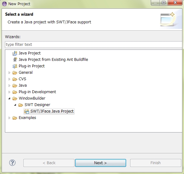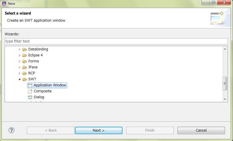 2. 【Application Window】(WindowBuilder/SWT Designer/SWT)を選択し、【Next】をクリックし、下記のダイアログが表示される。