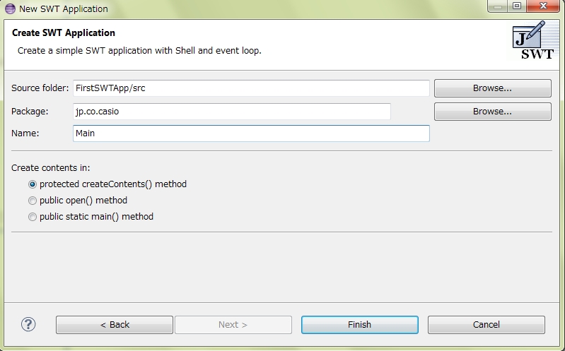 3. ポップアップウィンドウに【Package】と【Name】を入力し、【Finish】をクリックする。一つSWTアプリケーションを新規した。