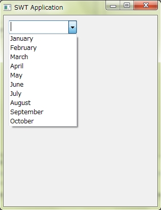 1 2 3 4 5 6 7 8 9 10 11 12 13 14 15 16 17 | // シンプルコンボ Combo combo1 = new Combo(shell,SWT.SIMPLE); combo1.add("Item1"); combo1.add("Item2"); // ドロップダウン(入力可能) String[] MONTHS = { "January", "February", "March", "April", "May", "June", "July", "August", "September", "October" }; Combo combo2= new Combo(shell, SWT.DOWN); combo2.setItems(MONTHS); combo2.setBounds(10,10,134,24); combo2.setText("January"); // デフォルトで表示される文字列を設定 // ドロップダウン(入力不可) Combo combo3 = new Combo(shell,SWT.READ_ONLY); combo3.add("Item1"); combo3.add("Item2"); combo3.select(0); // 最初のアイテムを選択状態にする |