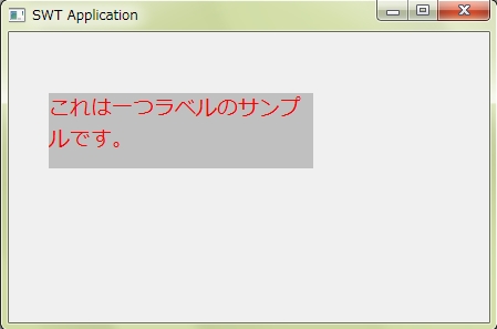 1 2 3 4 5 6 | Label lblNewLabel = new Label(shell, SWT.WRAP); lblNewLabel.setFont(SWTResourceManager.getFont("メイリオ", 14, SWT.NORMAL)); lblNewLabel.setBackground(SWTResourceManager.getColor(SWT.COLOR_GRAY)); lblNewLabel.setForeground(SWTResourceManager.getColor(SWT.COLOR_RED)); lblNewLabel.setBounds(36, 55, 239, 68); lblNewLabel.setText("これは一つラベルのサンプルです。"); |