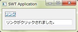 1 2 3 4 5 6 7 8 9 10 11 12 13 | final Link link = new Link(shell, SWT.NONE); link.setText("<a>リンク</a>"); link.setBounds(10, 10, 47, 20); link.addSelectionListener(new org.eclipse.swt.events.SelectionAdapter() { public void widgetSelected(org.eclipse.swt.events.SelectionEvent e) { text.setText("リンクがクリックされました。"); } }); link.setLayoutData(new GridData(GridData.FILL_HORIZONTAL)); text = new Text(shell, SWT.BORDER); text.setLayoutData(new GridData(GridData.FILL_HORIZONTAL)); text.setBounds(10, 36, 226, 20); |