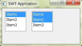1 2 3 4 5 6 7 8 9 10 11 12 13 | // 単一選択のリスト List list1 = new List(shell,SWT.SINGLE|SWT.BORDER|SWT.V_SCROLL); list1.add("Item1"); list1.add("Item2"); list1.add("Item3"); list1.setBounds(10, 10, 71, 68); // 複数選択可能なリスト List list2 = new List(shell,SWT.MULTI|SWT.BORDER|SWT.V_SCROLL); list2.add("Item1"); list2.add("Item2"); list2.add("Item3"); list2.setBounds(100, 10, 71, 68); |
