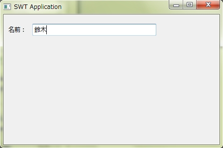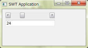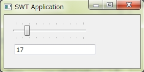 Sliderはいわゆるスクロールバーです。値の調節や、他のコンポーネントと同期してスクロールさせることが可能です。 コンストラクタにSWT.HORIZONTALを指定すると水平スクロールバーに、SWT.VERTICALを指定すると垂直スクロールバーになります。 以下にSliderの値をテキストボックスに表示する簡単なサンプルを示します。