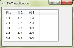 1 2 3 4 5 6 7 8 9 10 11 12 13 14 15 16 17 18 19 | Table table = new Table(shell, SWT.MULTI | SWT.FULL_SELECTION | SWT.BORDER); table.setBounds(10,10,233,138); // ヘッダを可視にする table.setHeaderVisible(true); // ヘッダを設定 String[] cols = { "列1", "列2", "列3" }; for (int i = 0; i < cols.length; i++) { TableColumn col = new TableColumn(table, SWT.LEFT); col.setText(cols[i]); col.setWidth(50); } // データを設定 for (int i = 0; i < 5; i++) { TableItem item = new TableItem(table, SWT.NULL); String[] data = { String.valueOf(i + 1) + "-1", String.valueOf(i + 1) + "-2", String.valueOf(i + 1) + "-3" }; item.setText(data); } |