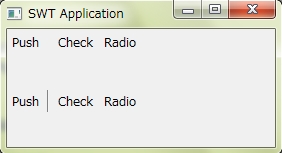 1 2 3 4 5 6 7 8 9 10 11 12 13 14 15 16 17 18 19 20 21 22 23 24 25 26 27 28 | shell.setLayout(new FillLayout(SWT.VERTICAL)); //----- ToolBar1 ToolBar tb1 = new ToolBar(shell, SWT.NONE); ToolItem item1 = new ToolItem(tb1, SWT.PUSH); item1.setText("Push"); ToolItem item2 = new ToolItem(tb1, SWT.SEPARATOR); ToolItem item3 = new ToolItem(tb1, SWT.CHECK); item3.setText("Check"); ToolItem item4 = new ToolItem(tb1, SWT.RADIO); item4.setText("Radio"); //----- ToolBar2 ToolBar tb2 = new ToolBar(shell, SWT.FLAT); ToolItem item5 = new ToolItem(tb2, SWT.PUSH); item5.setText("Push"); ToolItem item6 = new ToolItem(tb2, SWT.SEPARATOR); ToolItem item7 = new ToolItem(tb2, SWT.CHECK); item7.setText("Check"); ToolItem item8 = new ToolItem(tb2, SWT.RADIO); item8.setText("Radio"); |