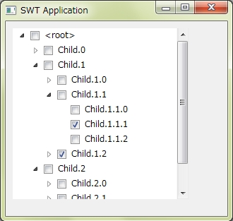 1 2 | // ツリーの各要素にチェックボックスを表示 Tree tree = new Tree(sShell, SWT.BORDER|SWT.CHECK); |