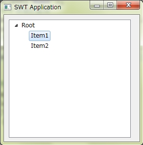 1 2 3 4 5 6 7 8 9 | // ルートとなる要素を追加 TreeItem root = new TreeItem(tree,SWT.NULL); root.setText("Root"); // ルートの子要素を追加 TreeItem item1 = new TreeItem(root,SWT.NULL); item1.setText("Item1"); // ルートの子要素を追加 TreeItem item2 = new TreeItem(root,SWT.NULL); item2.setText("Item2"); |