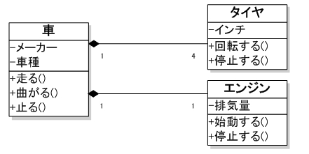 双方のオブジェクト間に「全体-部分」の関係が成り立っているときに用いられる。