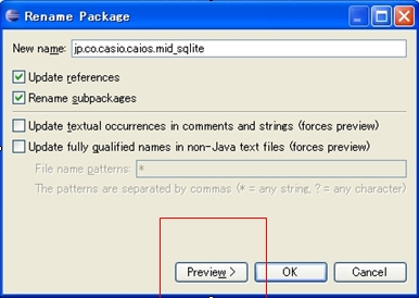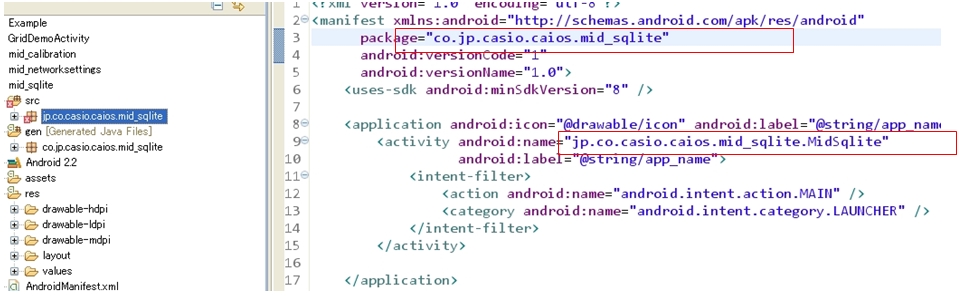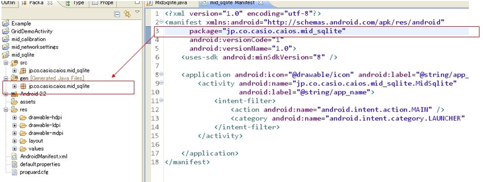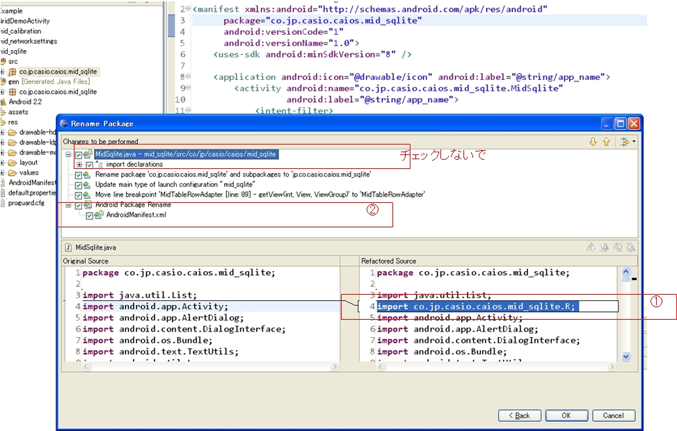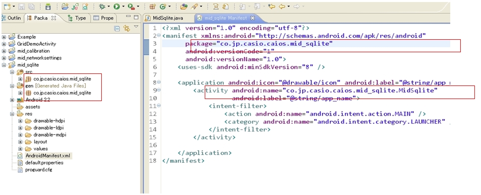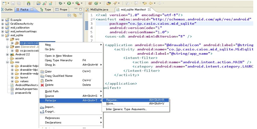 パッケージ名が正しくない場合は、Eclipseツールのリネーム機能を利用して名称を変更すればエラーになるので、修正の手順は下記通りです 1.下記のパッケージ名[co.jp.caiso.caios.mid_sqlite]は、[jp.co.caiso.caios.mid_sqlite]に変更したい