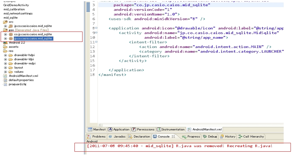 7.下記の通り、修正できます。 手で[AndroidManifest.xmlのpackageの内容を新しいパッケージ名を修正すると、フォルダ[/gen]したのパッケージ名を自動的に修正できる。