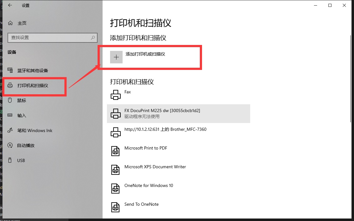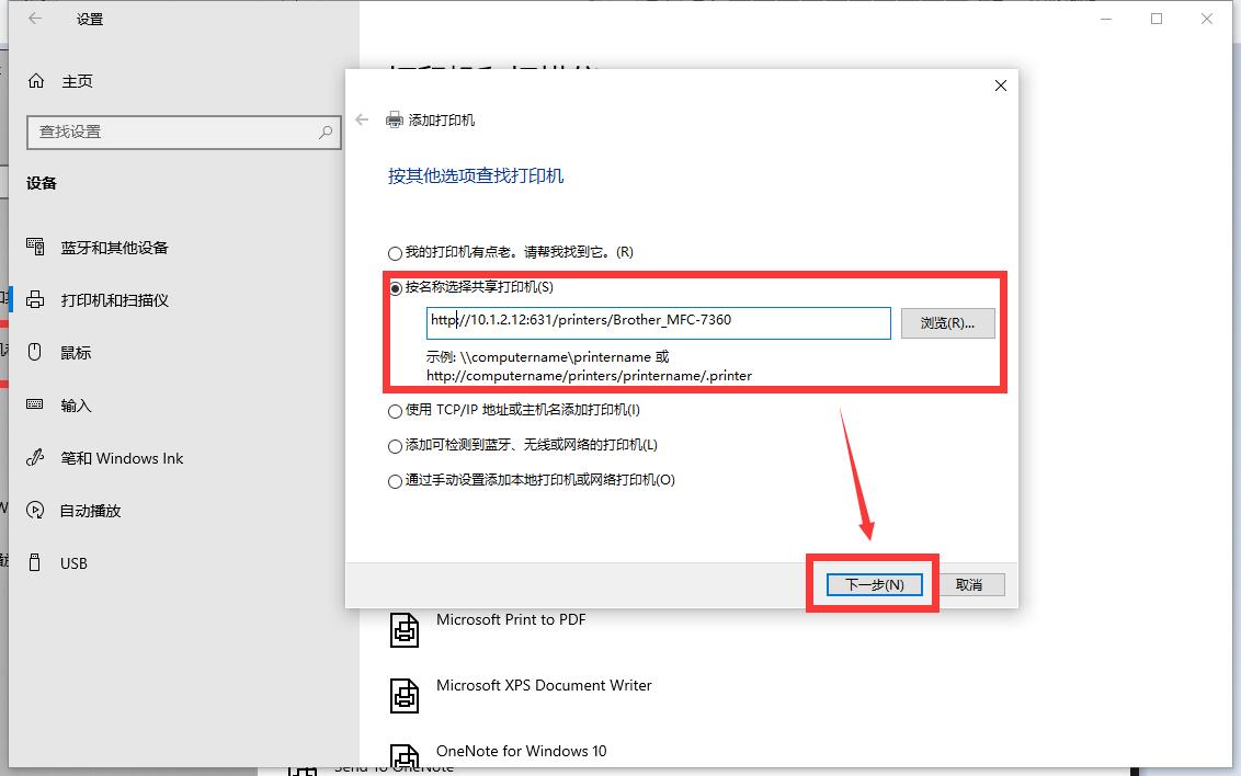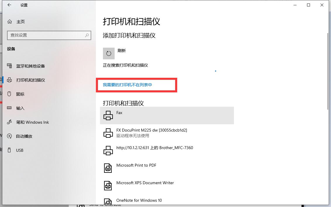 添加打印机¶ 打开windows设置 进入打印机设置页面并点击添加打印机 等待载入,点击选项 添加打印机地址 (http://10.1.2.12:631/printers/Brother_MFC-7360) 安装时选择对应驱动