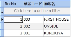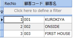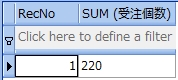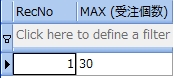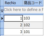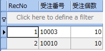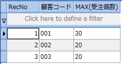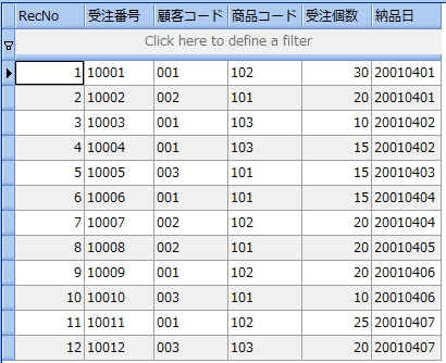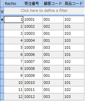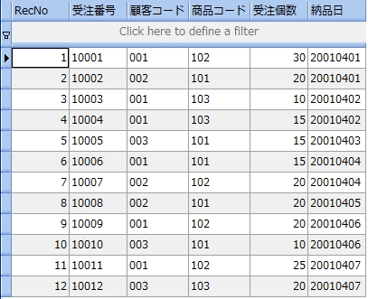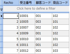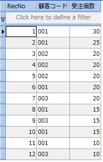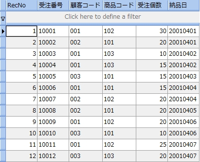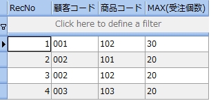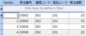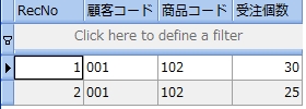 次のサンプルは、受注表から受注個数が 20 より大きい顧客コードと商品コードを調べるものです。尚、分かりやすくするために受注個数も参照しています。