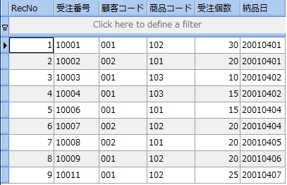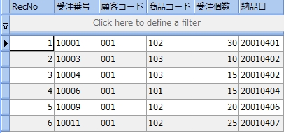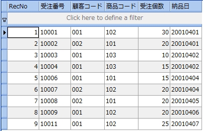 データが入力されたテーブルから必要なデータを参照するには、SQL 文を用いてデータベースに問い合わせなければなりません。このようにデータベースに問い合わせて指定した情報を生成させる命令をクエリ (QUERY) といいます。具体的には SELECT 文を用いてデータベースに欲しいデータを生成するように指示します。 SELECT 文の説明のために次の受注表を用意します。既にテーブルの定義とデータの入力は終っています。