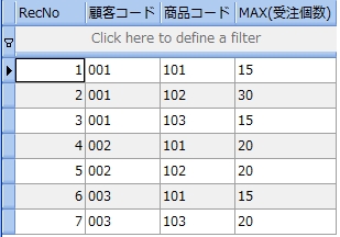 SELECT 顧客コード , 商品コード , MAX(受注個数) FROM 受注表