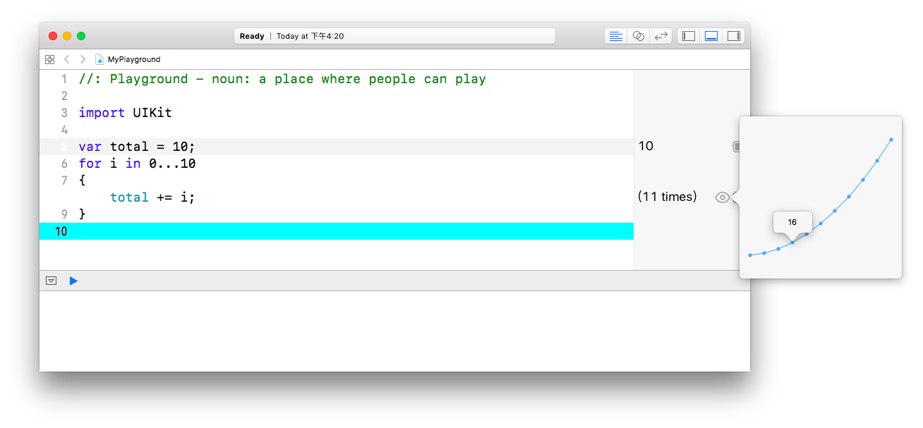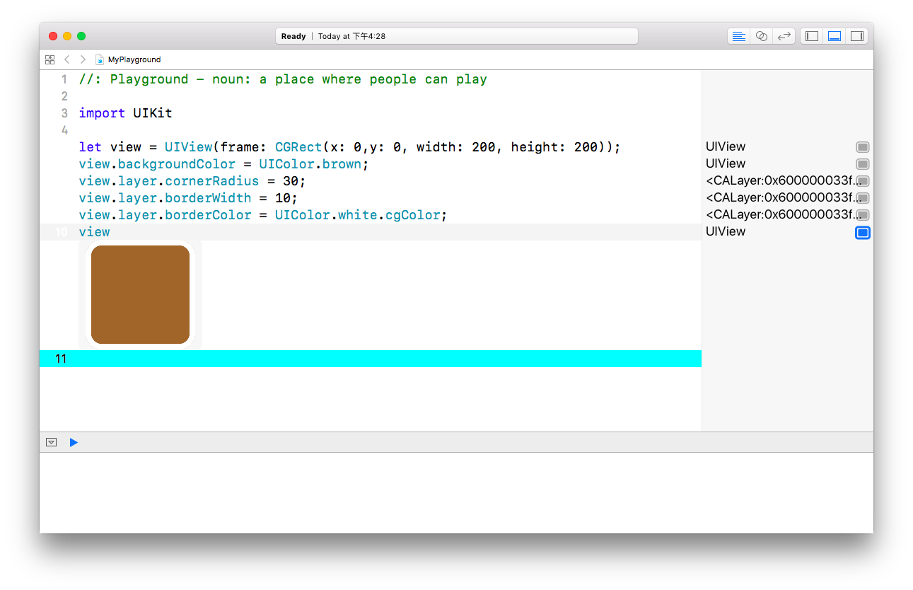 Playground提供了及时显示结果的功能,是一个开发辅助工具。你甚至可以使用Playground进行UIKit的开发。如下图所示,创建了一个自定义外观的UIView视图。